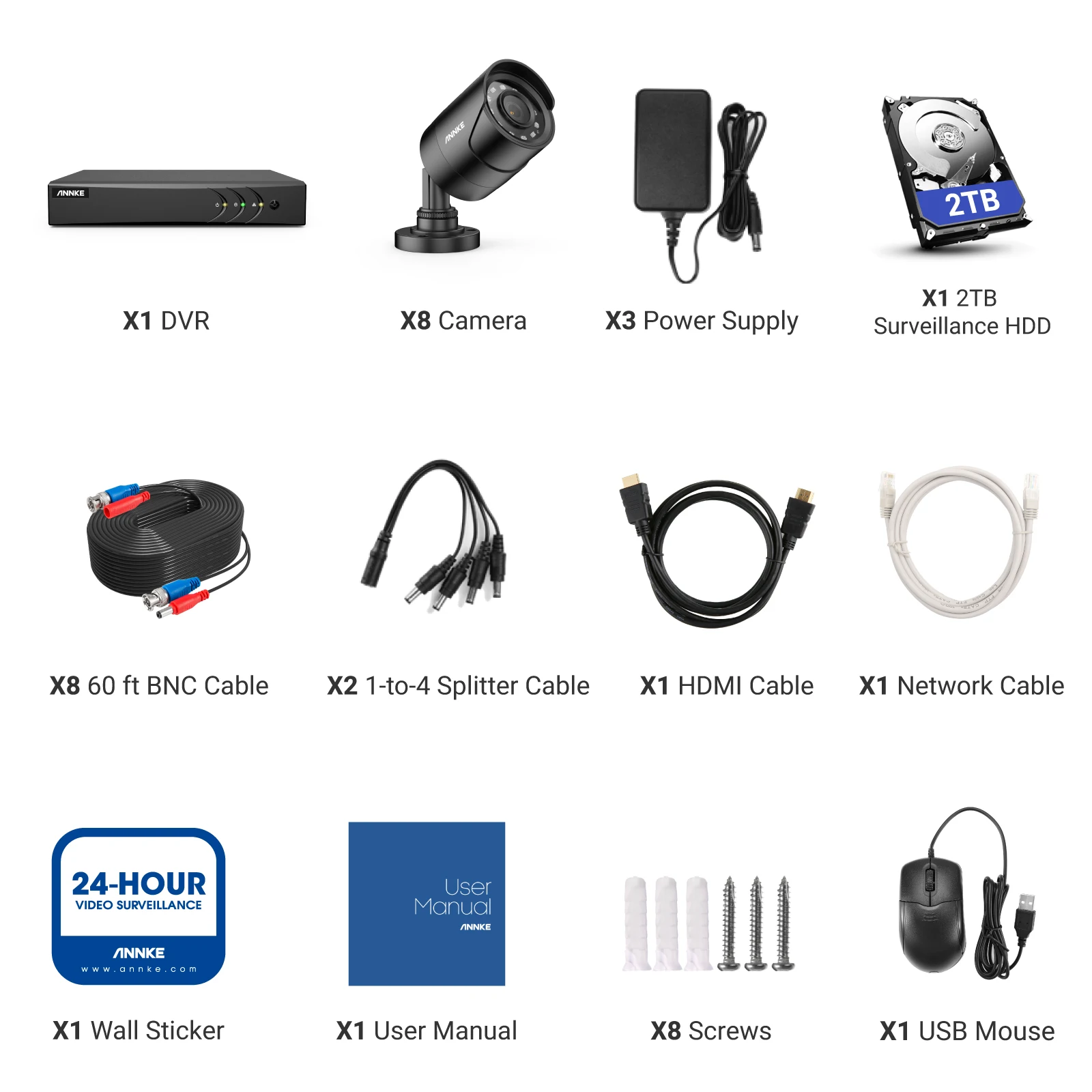 8 pcs security cameras deliver the best 1080p live view at 30 fps & up to 100 ft night vision. The advanced sensor & smart IR help capture clear images without noise. The 5-in-1 5MP Lite DVR works with TVI, AHD, CVI, CVBS & IP cameras.