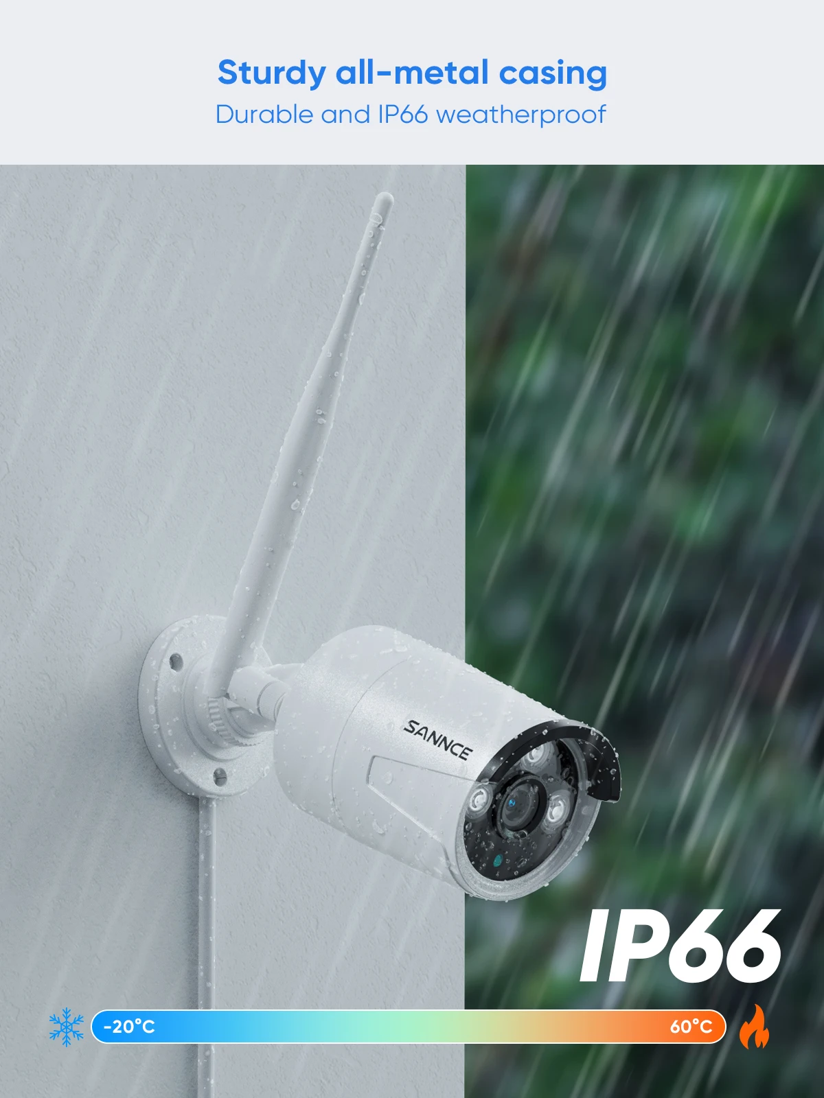 ANNKE surveillance camera has a solid Metal,with anIP66 waterproof rating. So you can feel free to install it outdoor, like in your garage, backyard, or anywhere else. It can stand harsh weather conditions, including rain, snow, intense cold and heat.